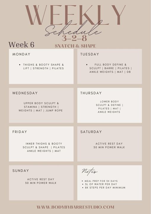 Follow the structure of the 3-2-8 method combining compound strength exercises, classical pilates & sculpt barre workouts to burn fat, build lean muscle mass & tone up from head to toe.